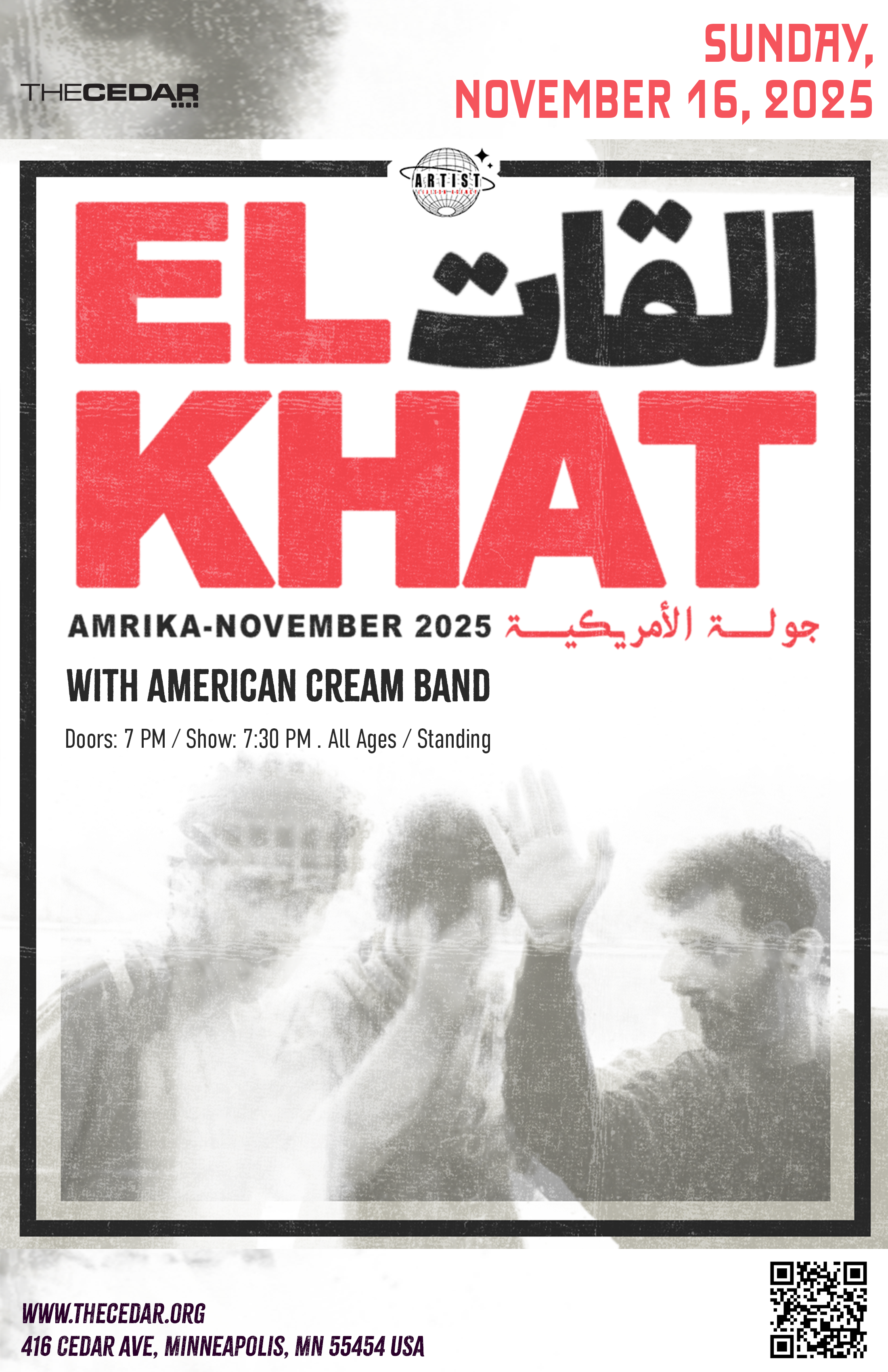 — El Khat perform Arabic tunes of Yemeni origin, led by multi-instrumentalist Eyal El Wahab. Experimenting with DIY homemade instruments, the trio’s psychedelic stomps fit comfortably in the global groove of similar artists like BALTHVS, Glass Beams, and Khruangbin. The Cedar welcomes El Khat back to the Twin Cities for their third performance in our room.
