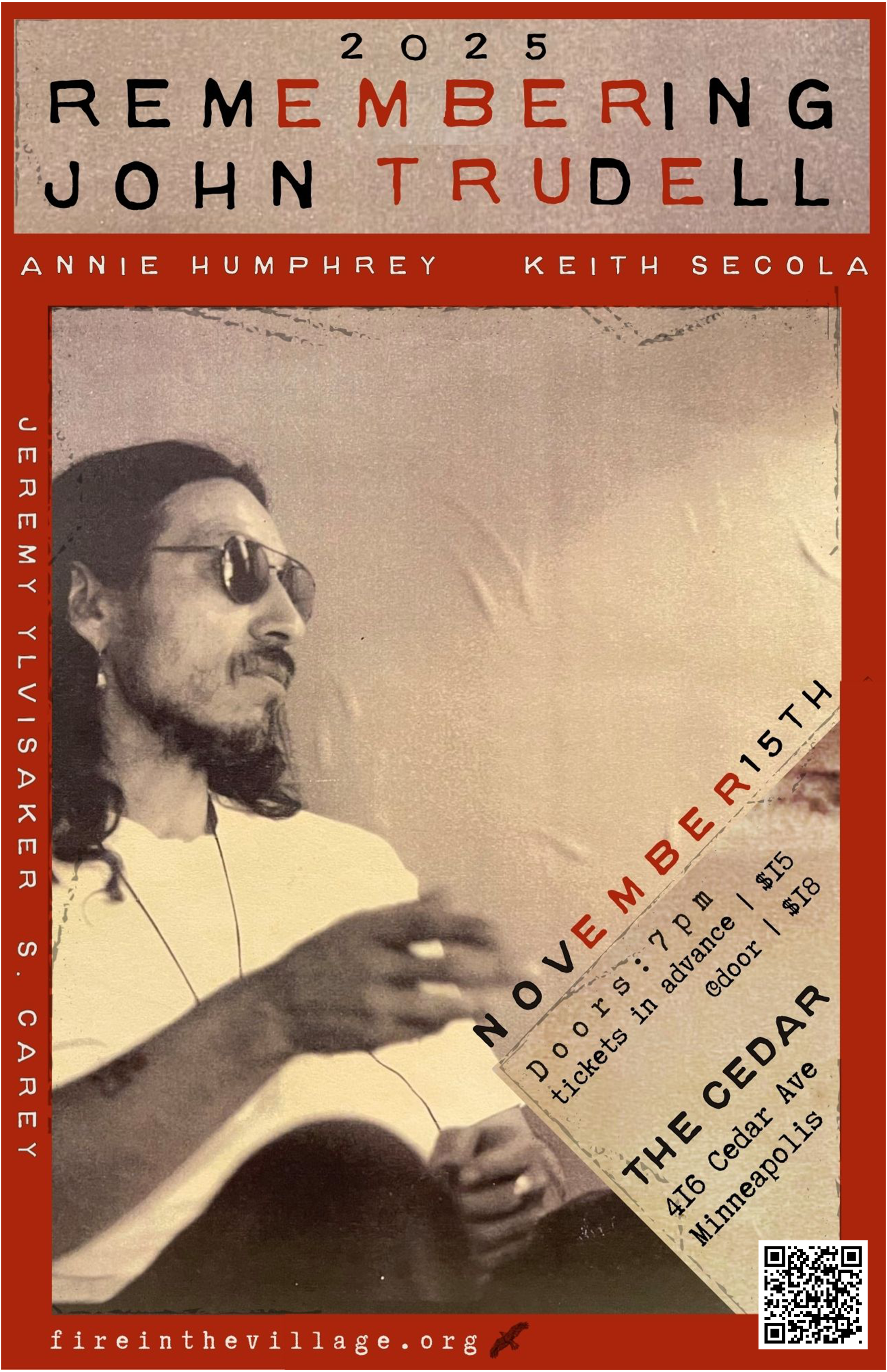 Offer: Remembering John Trudell with Annie Humphrey, Keith Secola, Jeremy Ylvisaker, and S. Carey — John Trudell has been physically gone for ten years now. His life and words continue to matter. John reminds us that if we use our intelligence and stay coherent, we will outlast them. This evening will not only celebrate his memories, wisdom, heart and love, but will revive his voice to make his words part of our own truth. This will help the powerless realize that they are anything but.